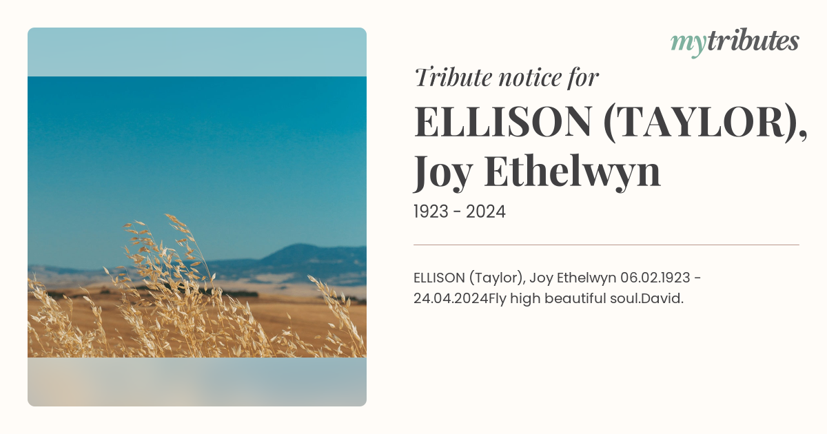 ELLISON (Taylor), Joy Ethelwyn 06.02.1923 - 24.04.2024Fly high beautiful soul.David.