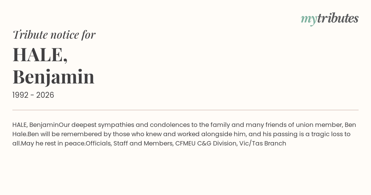 Our deepest sympathies and condolences to the family and many friends of union member, Ben Hale.