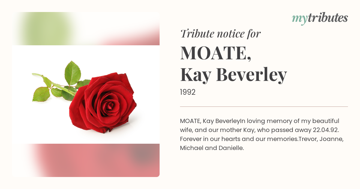 In loving memory of my beautiful wife, and our mother Kay, who passed away 22.04.92. Forever in our hearts and our memories.