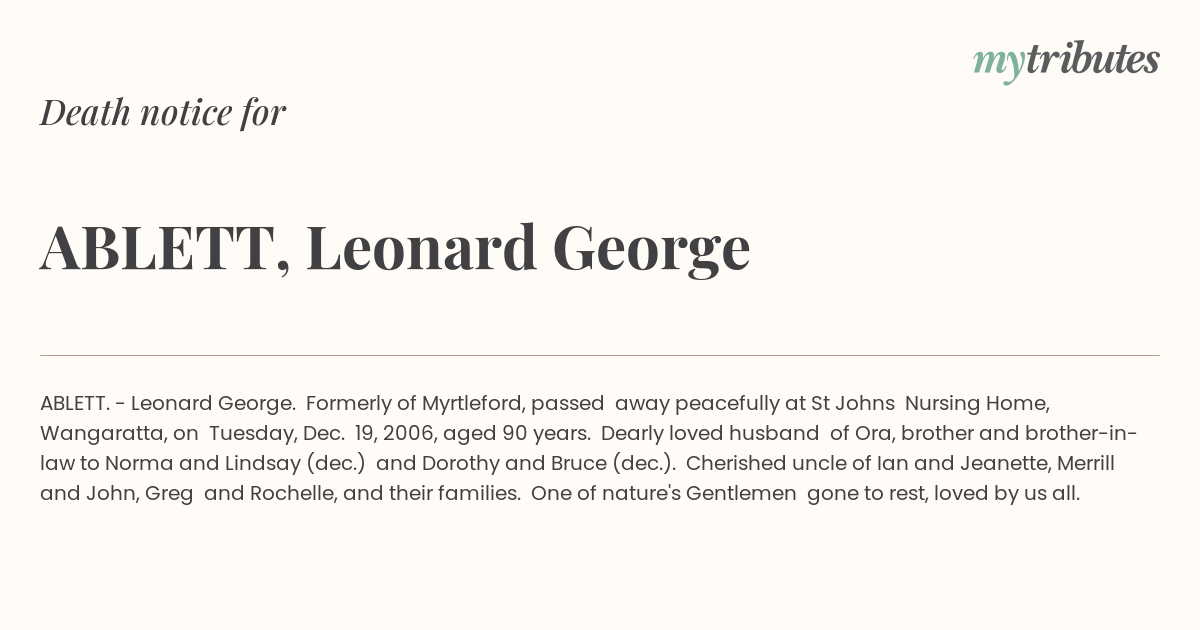 16°CABLETT. - Leonard George. Formerly of Myrtleford, passed away peacefully at St Johns Nursing Home, Wangaratta, on Tuesday, Dec. 19, 2006, aged 90 years. Dearly loved husband of Ora, brother and brother-in- law to Norma and Lindsay (dec.) and Dorothy and Bruce (dec.). Cherished uncle of Ian and Jeanette, Merrill and John, Greg and Rochelle, and their families. One of nature's Gentlemen gone to rest, loved by us all.