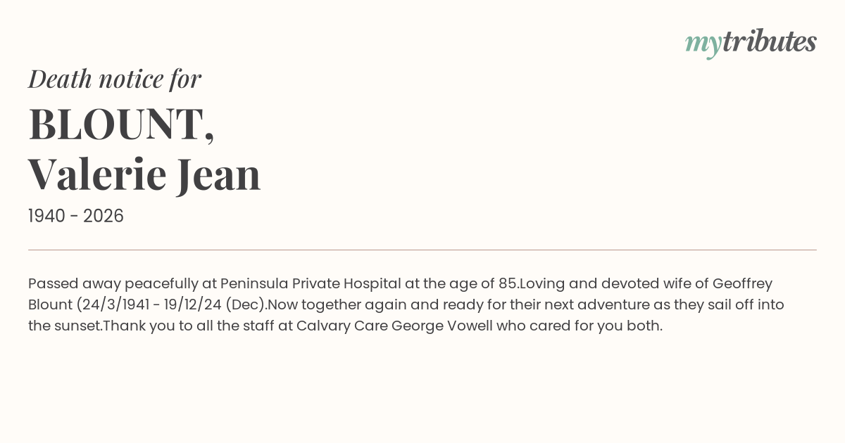 Loving and devoted wife of Geoffrey Blount (24/3/1941 - 19/12/24 (Dec).