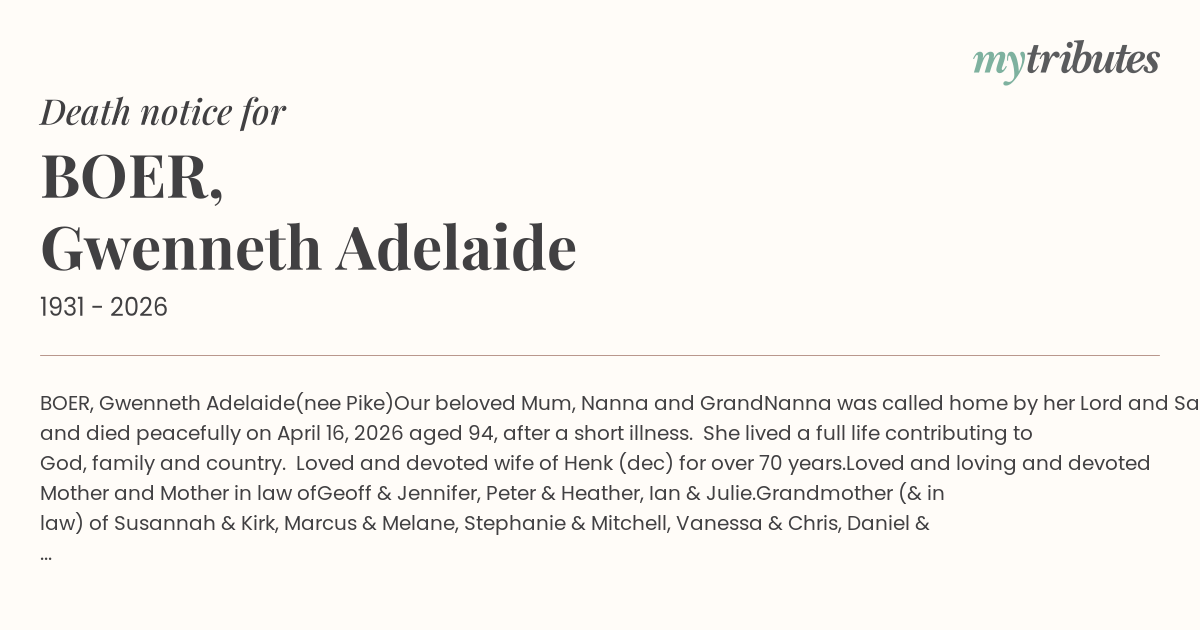 Our beloved Mum, Nanna and GrandNanna was called home by her Lord and Saviour and died peacefully on April 16, 2026 aged 94, after a short illness. She lived a full life contributing to God, family and country. Loved and devoted