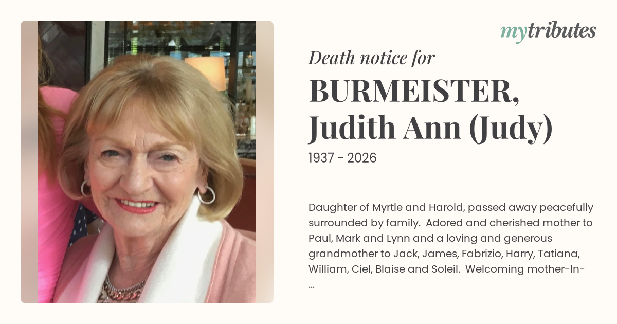 16°CDaughter of Myrtle and Harold, passed away peacefully surrounded by family. Adored and cherished mother to Paul, Mark and Lynn and a loving and generous grandmother to Jack, James, Fabrizio, Harry, Tatiana, William, Ciel, Blaise and Soleil. Welcoming mother-In-law to Janet and Fab.