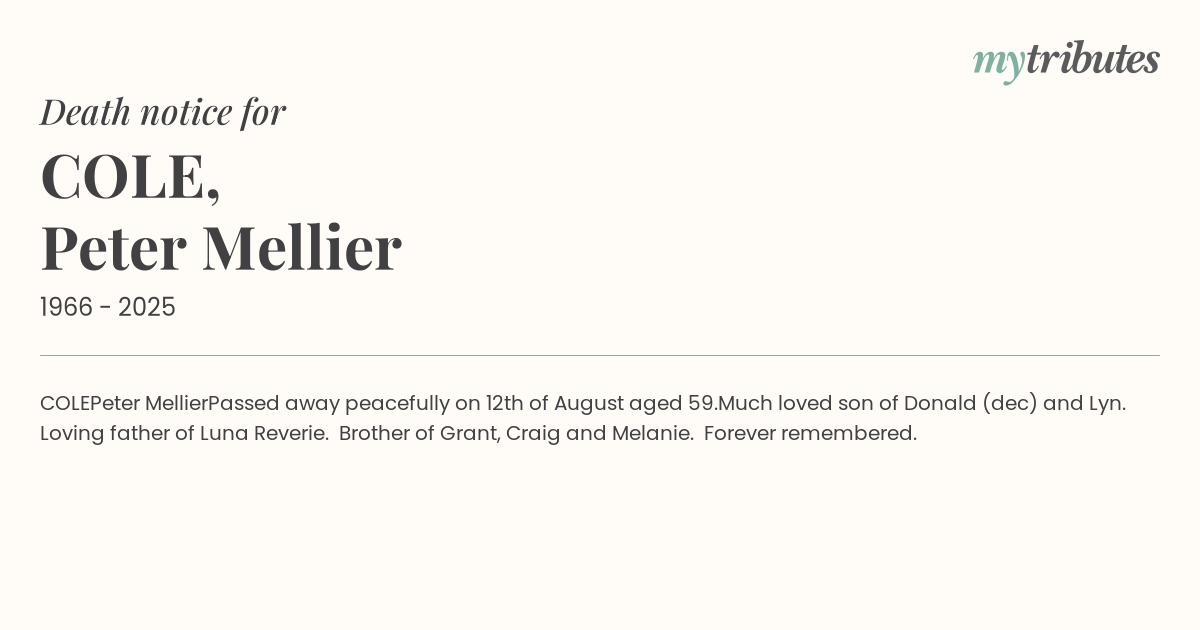 Loving father of Luna Reverie. Brother of Grant, Craig and Melanie.