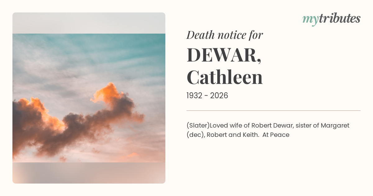 Loved wife of Robert Dewar, sister of Margaret (dec), Robert and Keith. At Peace