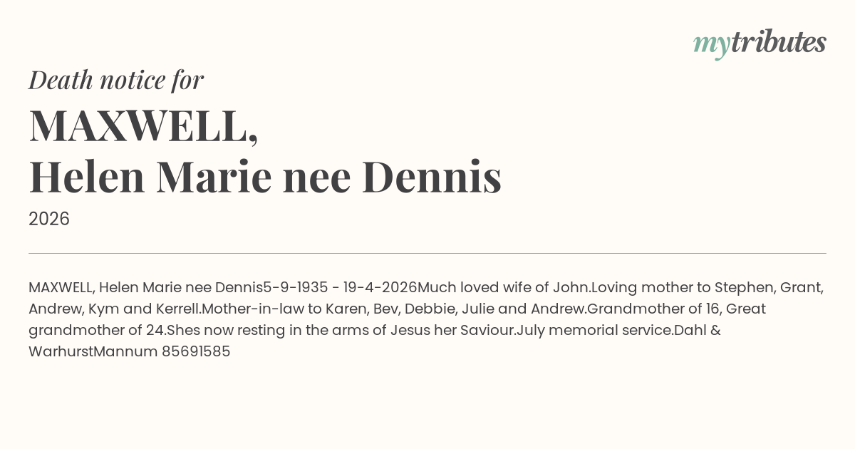 Loving mother to Stephen, Grant, Andrew, Kym and Kerrell.