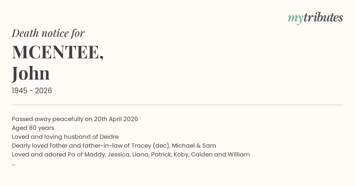16°CPassed away peacefully on 20th April 2026 Aged 80 years Loved and loving husband of Deidre Dearly loved father and father-in-law of Tracey (dec), Michael & Sam Loved and adored Pa of Maddy, Jessica, Liana, Patrick, Koby, Caiden and William Forever in our hearts A private cremation will take place