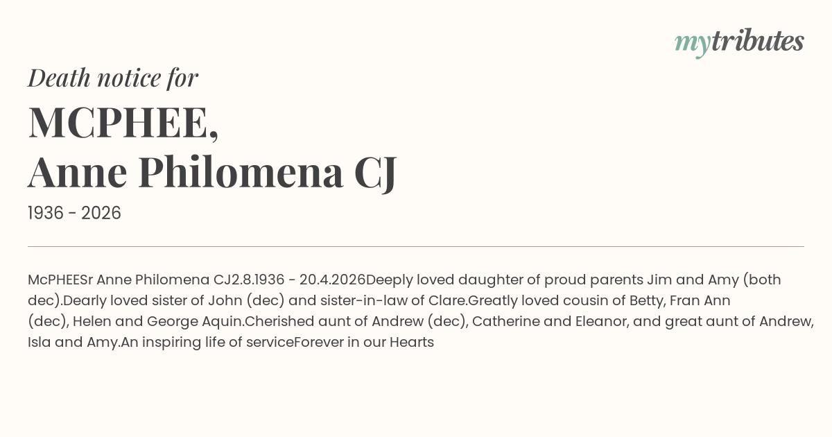 Cherished aunt of Andrew (dec), Catherine and Eleanor, and great aunt of Andrew, Isla and Amy.