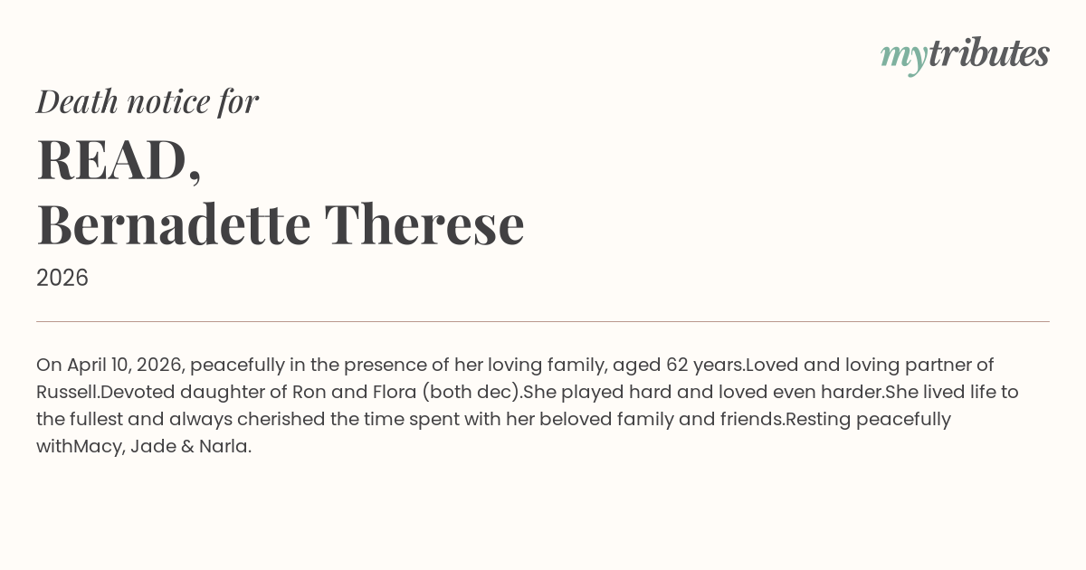 16°COn April 10, 2026, peacefully in the presence of her loving family, aged 62 years.