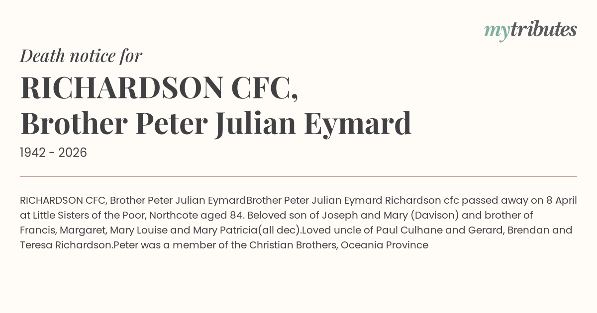 Brother Peter Julian Eymard Richardson cfc passed away on 8 April at Little Sisters of the Poor, Northcote aged 84. Beloved son of Joseph and Mary (Davison) and brother of Francis, Margaret, Mary Louise and Mary Patricia