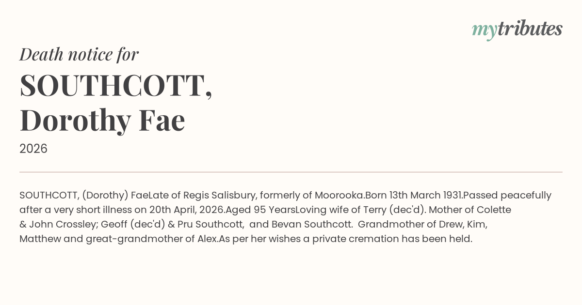 Loving wife of Terry (dec'd). Mother of Colette & John Crossley; Geoff (dec'd) & Pru Southcott, and Bevan Southcott. Grandmother of Drew, Kim, Matthew and great-grandmother of Alex.