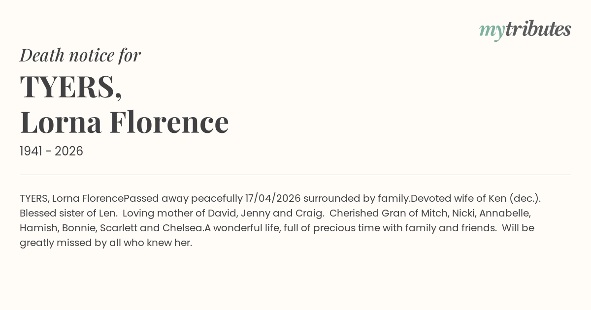 Devoted wife of Ken (dec.). Blessed sister of Len. Loving mother of David, Jenny and Craig. Cherished Gran of Mitch, Nicki, Annabelle, Hamish, Bonnie, Scarlett and Chelsea.