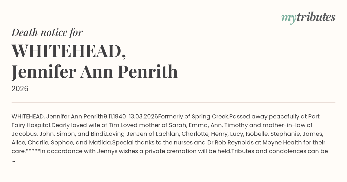 Loved mother of Sarah, Emma, Ann, Timothy and mother-in-law of Jacobus, John, Simon, and Bindi.