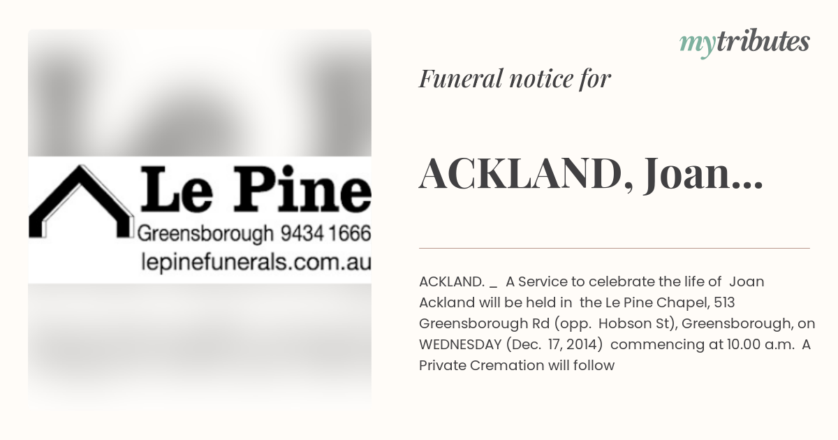 16°CACKLAND. _ A Service to celebrate the life of Joan Ackland will be held in the Le Pine Chapel, 513 Greensborough Rd (opp. Hobson St), Greensborough, on WEDNESDAY (Dec. 17, 2014) commencing at 10.00 a.m. A Private Cremation will follow