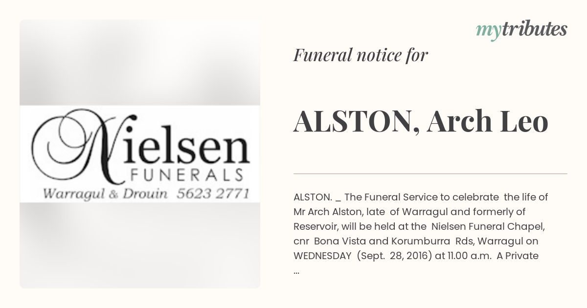 16°CALSTON. _ The Funeral Service to celebrate the life of Mr Arch Alston, late of Warragul and formerly of Reservoir, will be held at the Nielsen Funeral Chapel, cnr Bona Vista and Korumburra Rds, Warragul on WEDNESDAY (Sept. 28, 2016) at 11.00 a.m. A Private Cremation will follow