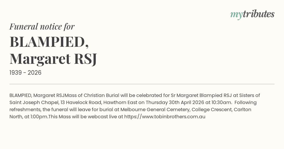 Sr Margaret Blampied RSJ at Sisters of Saint Joseph Chapel, 13 Havelock Road, Hawthorn East on Thursday 30th April 2026 at 10:30am.