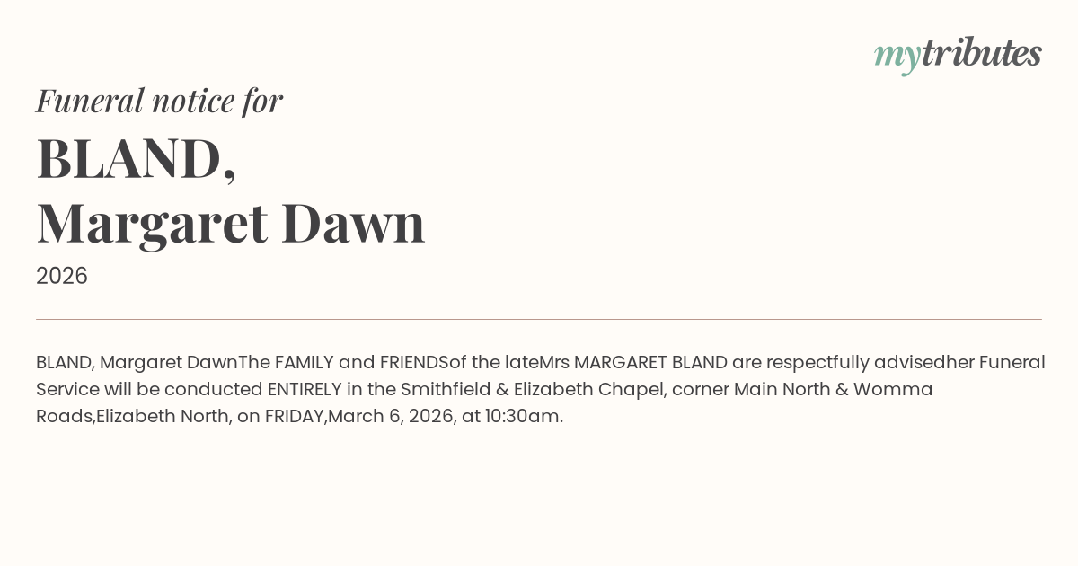 her Funeral Service will be conducted ENTIRELY in the Smithfield & Elizabeth Chapel, corner Main North & Womma Roads,