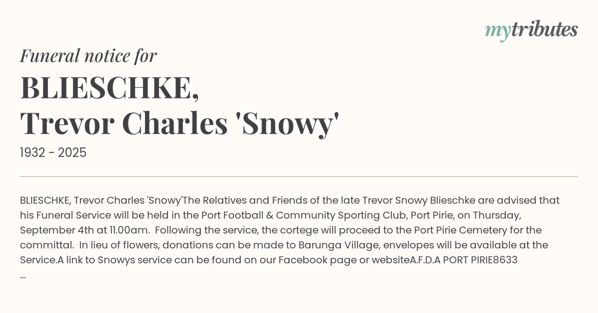 The Relatives and Friends of the late Trevor ‘Snowy’ Blieschke are advised that his Funeral Service will be held in the Port Football & Community Sporting Club, Port Pirie, on Thursday, September 4th at 11.00am.