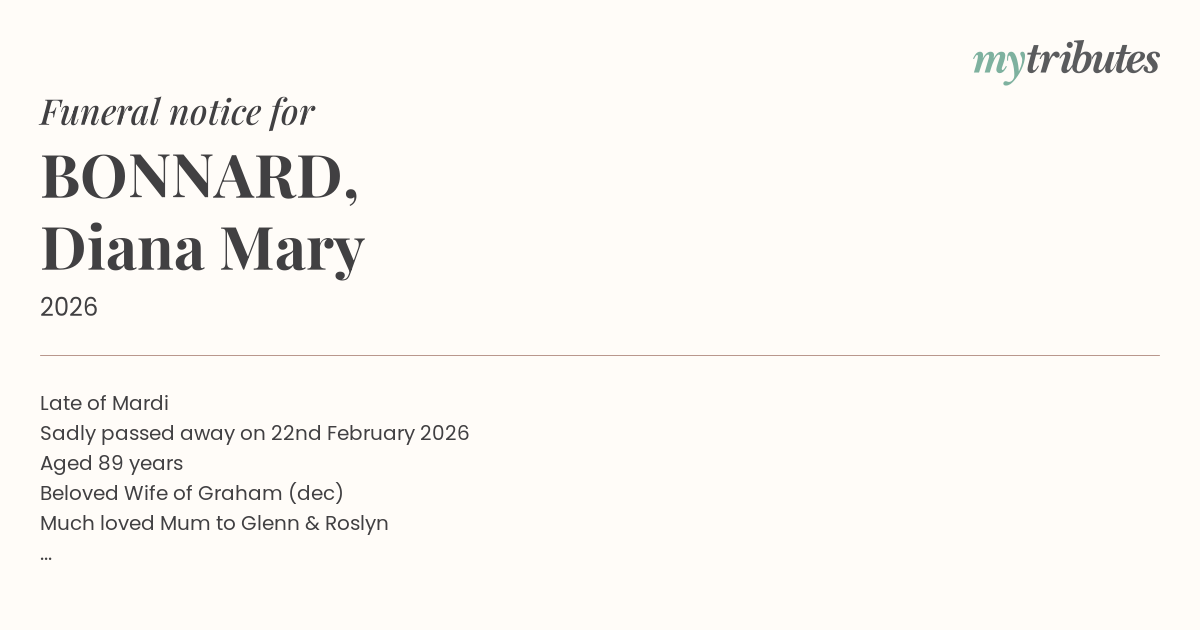 Family and Friends are warmly invited to attend a funeral service in the Rose Chapel at Palmdale Lawn Cemetery & Memorial Park, 57 Palmdale Road, Palmdale, NSW 2258, on Friday 6th March 2026 commencing at 12:00pm.