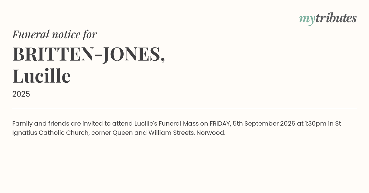 16°CFamily and friends are invited to attend Lucille's Funeral Mass on FRIDAY, 5th September 2025 at 1:30pm in St Ignatius Catholic Church, corner Queen and William Streets, Norwood.