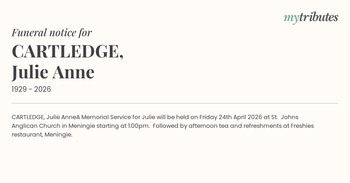 A Memorial Service for Julie will be held on Friday 24th April 2026 at St. Johns Anglican Church in Meningie starting at 1:00pm.