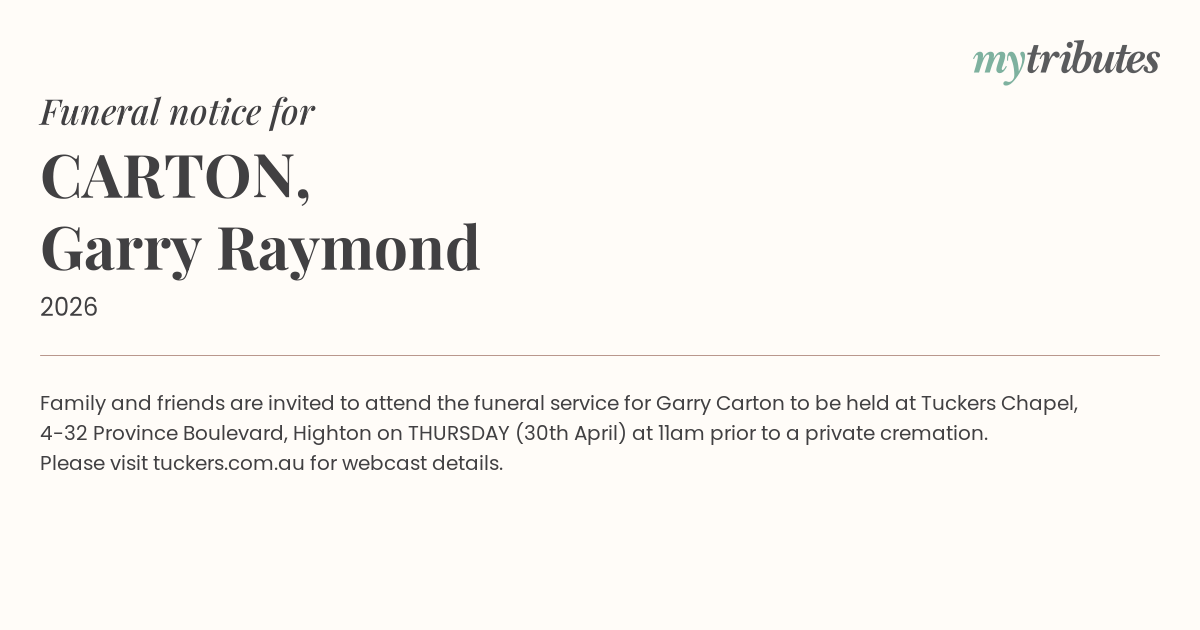16°CFamily and friends are invited to attend the funeral service for Garry Carton to be held at Tuckers Chapel, 4-32 Province Boulevard, Highton on THURSDAY (30th April) at 11am prior to a private cremation.