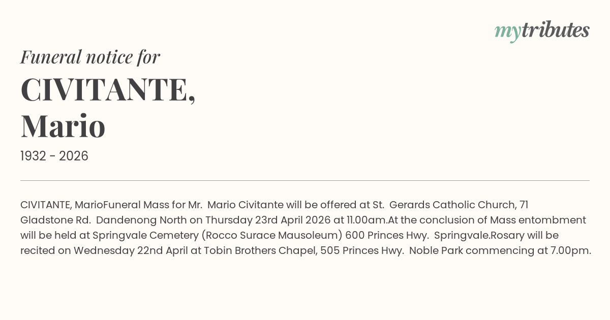 At the conclusion of Mass entombment will be held at Springvale Cemetery (Rocco Surace Mausoleum)