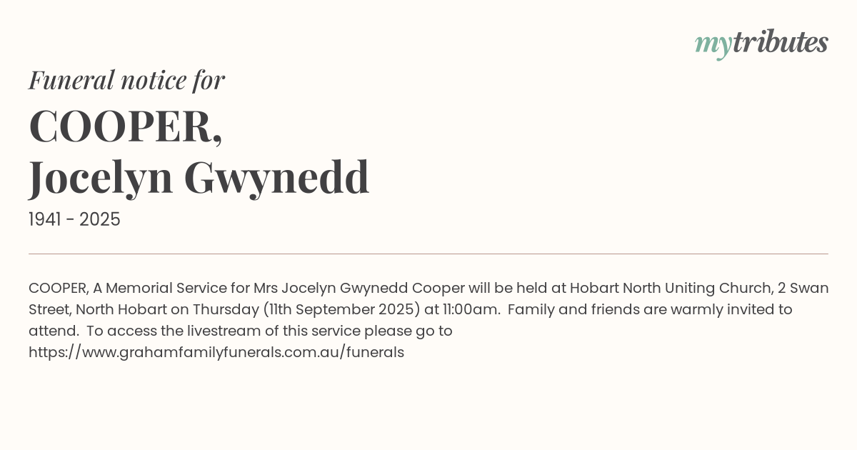 16°CCOOPER, A Memorial Service for Mrs Jocelyn Gwynedd Cooper will be held at Hobart North Uniting Church, 2 Swan Street, North Hobart on Thursday (11th September 2025) at 11:00am. Family and friends are warmly invited to attend. To access the livestream of this service please go to https://www.grahamfamilyfunerals.com.au/funerals