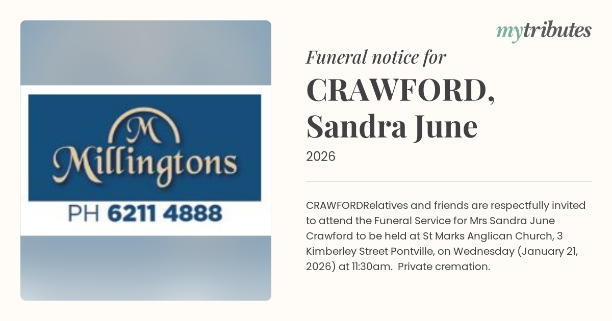 Relatives and friends are respectfully invited to attend the Funeral Service for Mrs Sandra June Crawford to be held at St Marks Anglican Church, 3 Kimberley Street Pontville, on Wednesday (January 21, 2026) at 11:30am.