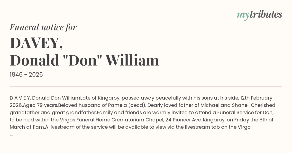 Family and friends are warmly invited to attend a Funeral Service for Don, to be held within the Virgo’s Funeral Home Crematorium Chapel, 24 Pioneer Ave, Kingaroy, on Friday the 6th of March at 11am.
