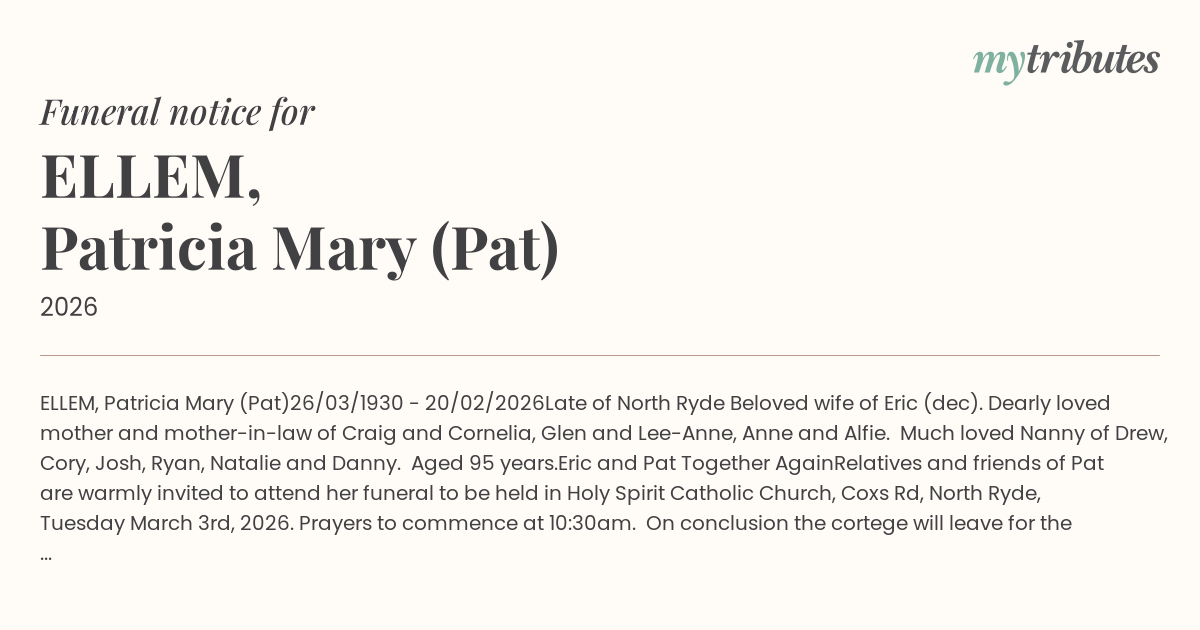 Relatives and friends of Pat are warmly invited to attend her funeral to be held in Holy Spirit Catholic Church, Coxs Rd, North Ryde, Tuesday March 3rd, 2026. Prayers to commence at 10:30am.