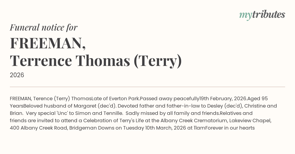 Relatives and friends are invited to attend a Celebration of Terry's Life at the Albany Creek Crematorium, Lakeview Chapel, 400 Albany Creek Road, Bridgeman Downs on Tuesday 10th March, 2026 at 11am