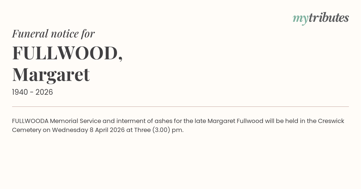 A Memorial Service and interment of ashes for the late Margaret Fullwood will be held in the Creswick Cemetery on Wednesday 8 April 2026 at Three (3.00) pm.