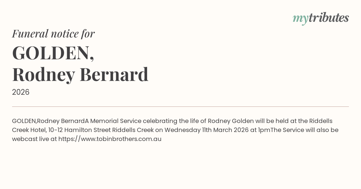 A Memorial Service celebrating the life of Rodney Golden will be held at the Riddells Creek Hotel, 10-12 Hamilton Street Riddells Creek on Wednesday 11th March 2026 at 1pm