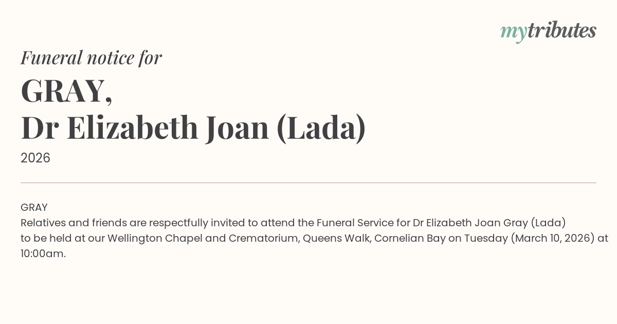 Relatives and friends are respectfully invited to attend the Funeral Service for Dr Elizabeth Joan Gray (Lada) to be held at our Wellington Chapel and Crematorium, Queens Walk, Cornelian Bay on Tuesday (March 10, 2026) at 10:00am.