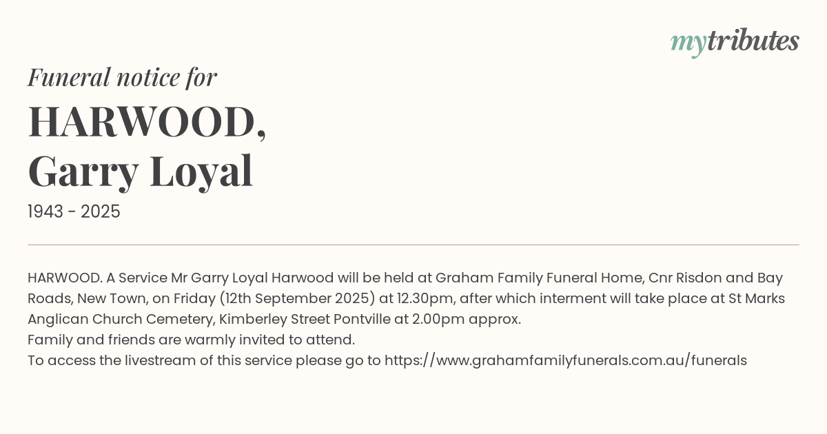 16°CHARWOOD. A Service Mr Garry Loyal Harwood will be held at Graham Family Funeral Home, Cnr Risdon and Bay Roads, New Town, on Friday (12th September 2025) at 12.30pm, after which interment will take place at St Marks Anglican Church Cemetery, Kimberley Street Pontville at 2.00pm approx.