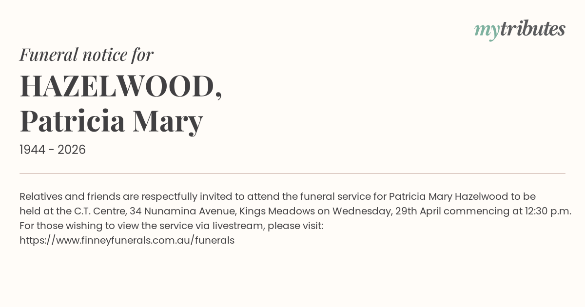 16°CRelatives and friends are respectfully invited to attend the funeral service for Patricia Mary Hazelwood to be held at the C.T. Centre, 34 Nunamina Avenue, Kings Meadows on Wednesday, 29th April commencing at 12:30 p.m.