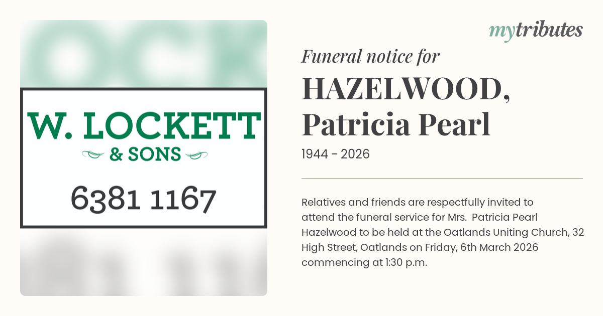 16°CRelatives and friends are respectfully invited to attend the funeral service for Mrs. Patricia Pearl Hazelwood to be held at the Oatlands Uniting Church, 32 High Street, Oatlands on Friday, 6th March 2026 commencing at 1:30 p.m.