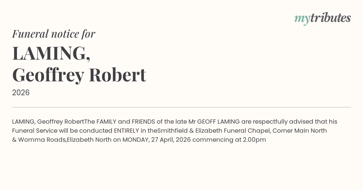 The FAMILY and FRIENDS of the late Mr GEOFF LAMING are respectfully advised that his Funeral Service will be conducted ENTIRELY in the