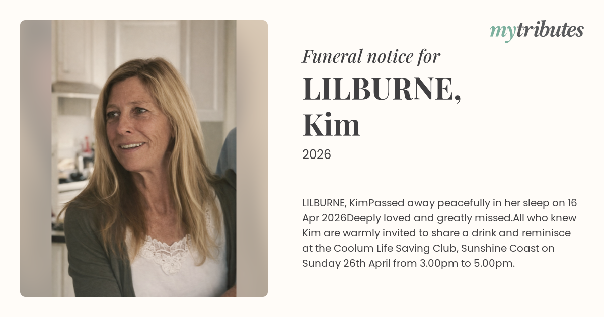All who knew Kim are warmly invited to share a drink and reminisce at the Coolum Life Saving Club, Sunshine Coast on Sunday 26th April from 3.00pm to 5.00pm.