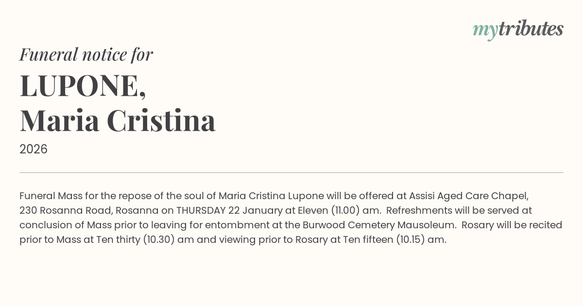 16°CFuneral Mass for the repose of the soul of Maria Cristina Lupone will be offered at Assisi Aged Care Chapel, 230 Rosanna Road, Rosanna on THURSDAY 22 January at Eleven (11.00) am. Refreshments will be served at conclusion of Mass prior to leaving for entombment at the Burwood Cemetery Mausoleum. Rosary will be recited prior to Mass at Ten thirty (10.30) am and viewing prior to Rosary at Ten fifteen (10.15) am.