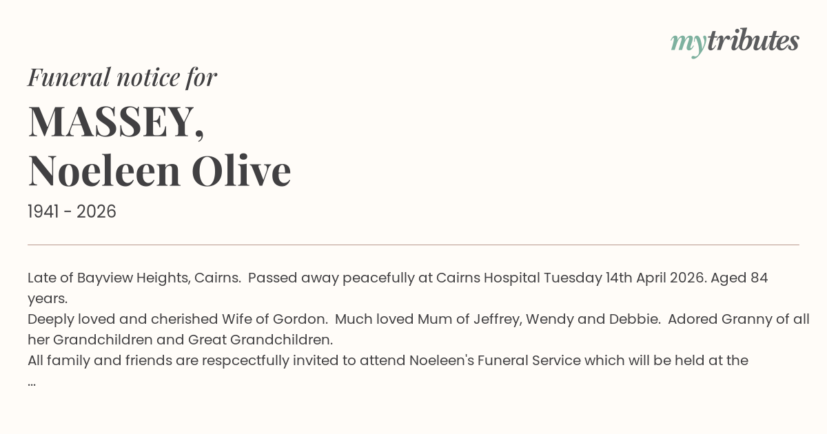 All family and friends are respcectfully invited to attend Noeleen's Funeral Service which will be held at the Cairns Funeral Directors Chapel, 36 Pease Street, Manoora on Thursday 30th April 2026 commencing at 11am.