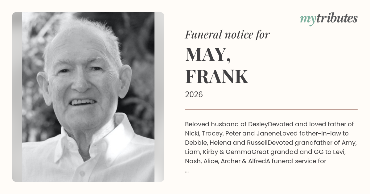 A funeral service for Frank will be held on Tuesday 3rd March, at the George Brown Botanic Gardens Event Centre, Darwin at 1.30pm.