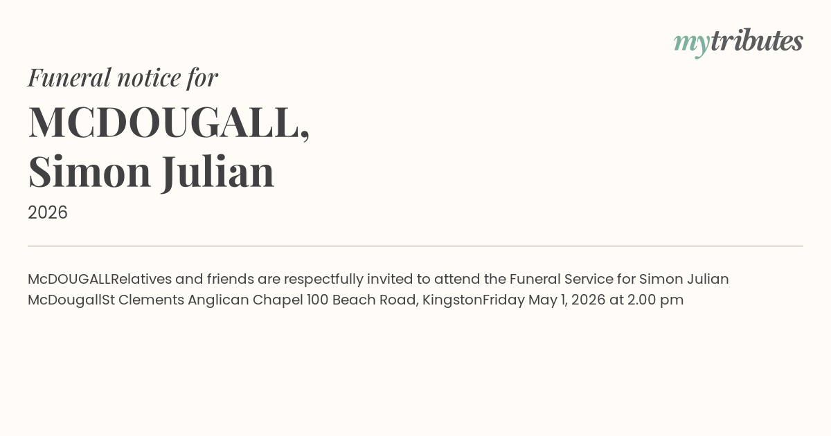 Relatives and friends are respectfully invited to attend the Funeral Service for Simon Julian McDougall