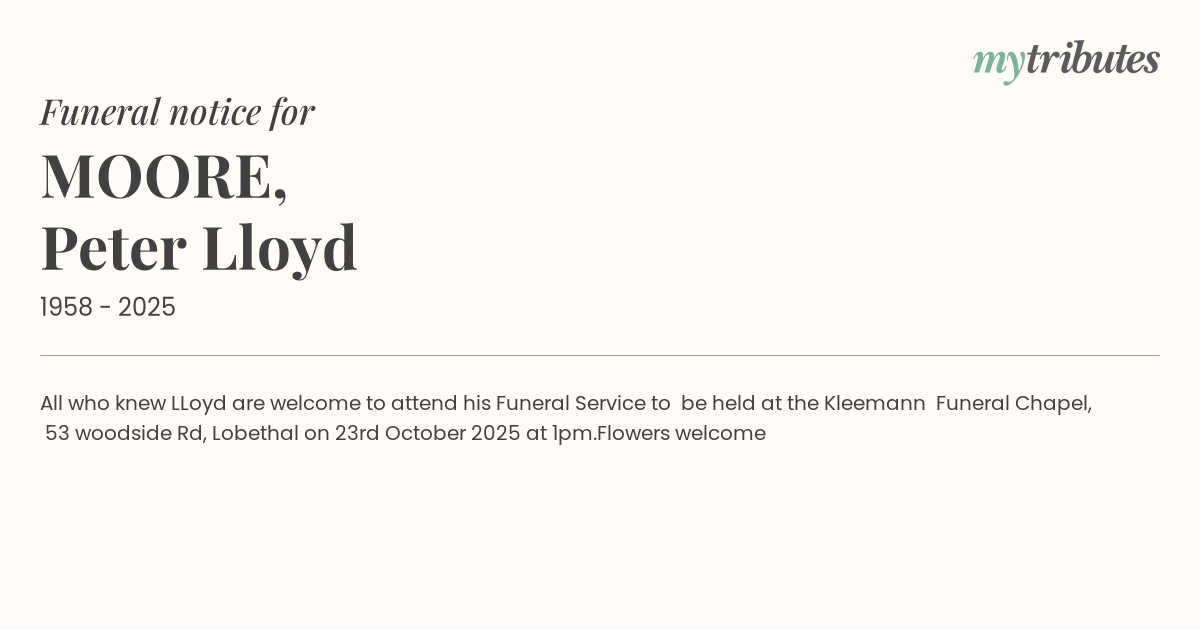 16°CAll who knew LLoyd are welcome to attend his Funeral Service to be held at the Kleemann Funeral Chapel,