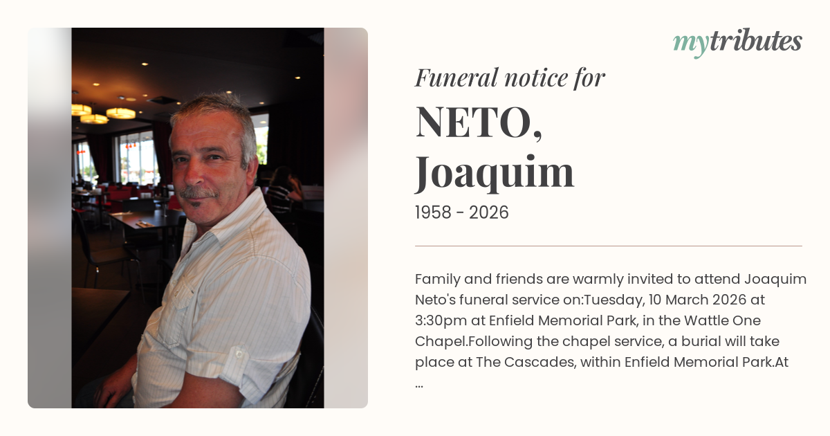 16°CFamily and friends are warmly invited to attend Joaquim Neto's funeral service on: