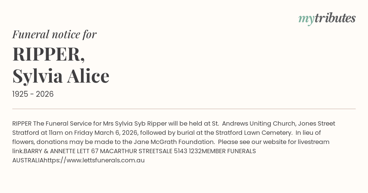 The Funeral Service for Mrs Sylvia ‘Syb’ Ripper will be held at St. Andrew’s Uniting Church, Jones Street Stratford at 11am on Friday March 6, 2026, followed by burial at the Stratford Lawn Cemetery.