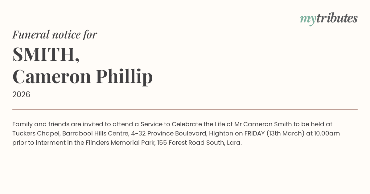 16°CFamily and friends are invited to attend a Service to Celebrate the Life of Mr Cameron Smith to be held at Tuckers Chapel, Barrabool Hills Centre, 4-32 Province Boulevard, Highton on FRIDAY (13th March) at 10.00am prior to interment in the Flinders Memorial Park, 155 Forest Road South, Lara.