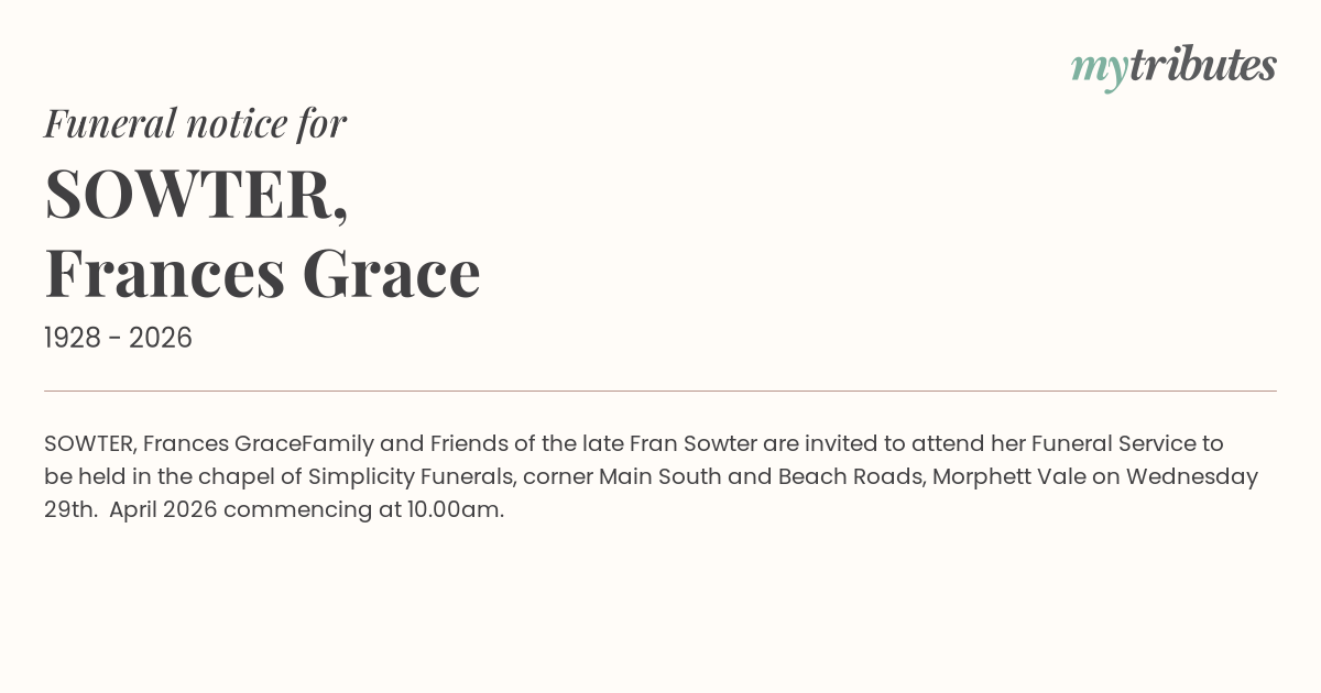 Family and Friends of the late Fran Sowter are invited to attend her Funeral Service to be held in the chapel of Simplicity Funerals, corner Main South and Beach Roads, Morphett Vale on Wednesday 29th. April 2026 commencing at 10.00am.
