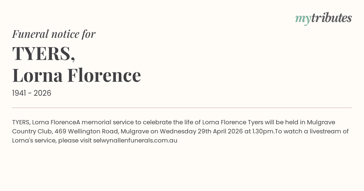 A memorial service to celebrate the life of Lorna Florence Tyers will be held in Mulgrave Country Club, 469 Wellington Road, Mulgrave on Wednesday 29th April 2026 at 1.30pm.